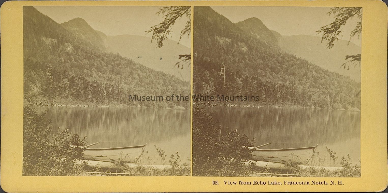Black and white image of a lake surrounded by trees and mountains. A canoe is in the foreground on a sandy shore. Caption reads, "View from Echo Lake, Franconia Notch NH." Back Description: Wood-like pattern.