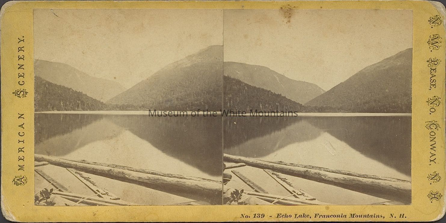 Black and white image of a lake surrounded by mountains with a sandy beach in the background. In the foreground is a dam. Caption reaads, "Echo Lake Franconia Notch NH." Part of the "American Scenery" stereoview series. Back Description: Plain