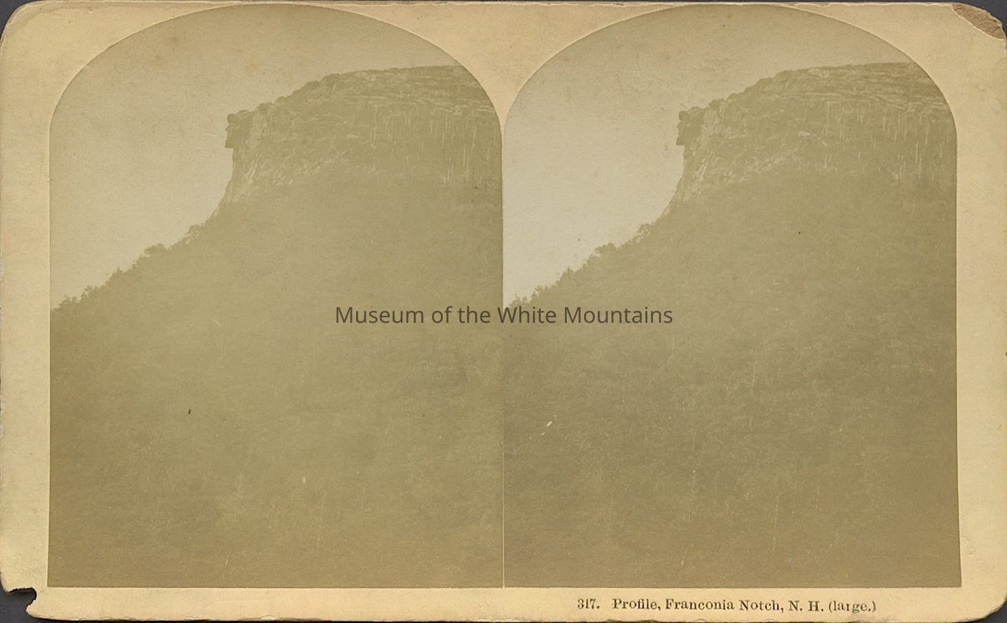 Black and white image of a rock formation on a mountain. Caption reads, "Profile, Franconia Notch NH." Back Description: Plain
