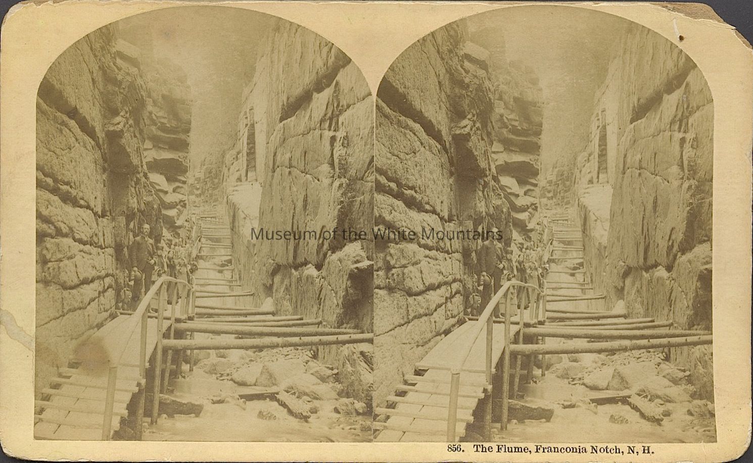 Black and white image of several people standing on a footbridge in a rocky gorge. Caption reads, "The Flume, Franconia Notch NH." Back Description: Plain