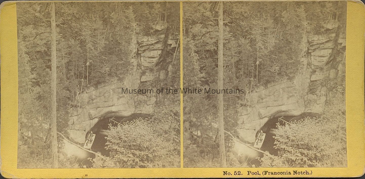 Black and white image of a pool by a rocky mountain ledge with trees. A raft with people is on the water. Caption reads, "Pool, Franconia Notch." Back Description: Plain