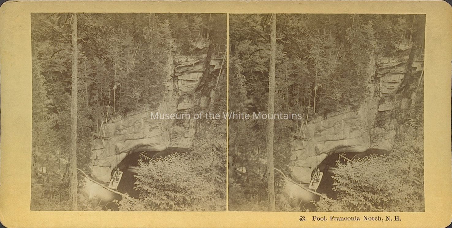 Black and white image of a pool by a rocky mountain ledge with trees. A raft with people is on the water. Caption reads, "Pool, Franconia Notch." Back Description: Plain