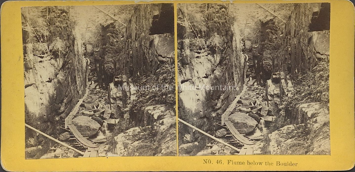 Flume, The (Grafton county, New Hampshire : valley), Franconia (Grafton county, New Hampshire : inhabited place), Suspended Boulder (Grafton county, New Hampshire : rock), White Mountains (New Hampshire : mountains), rocks, boulders, trees, streams, footbridges