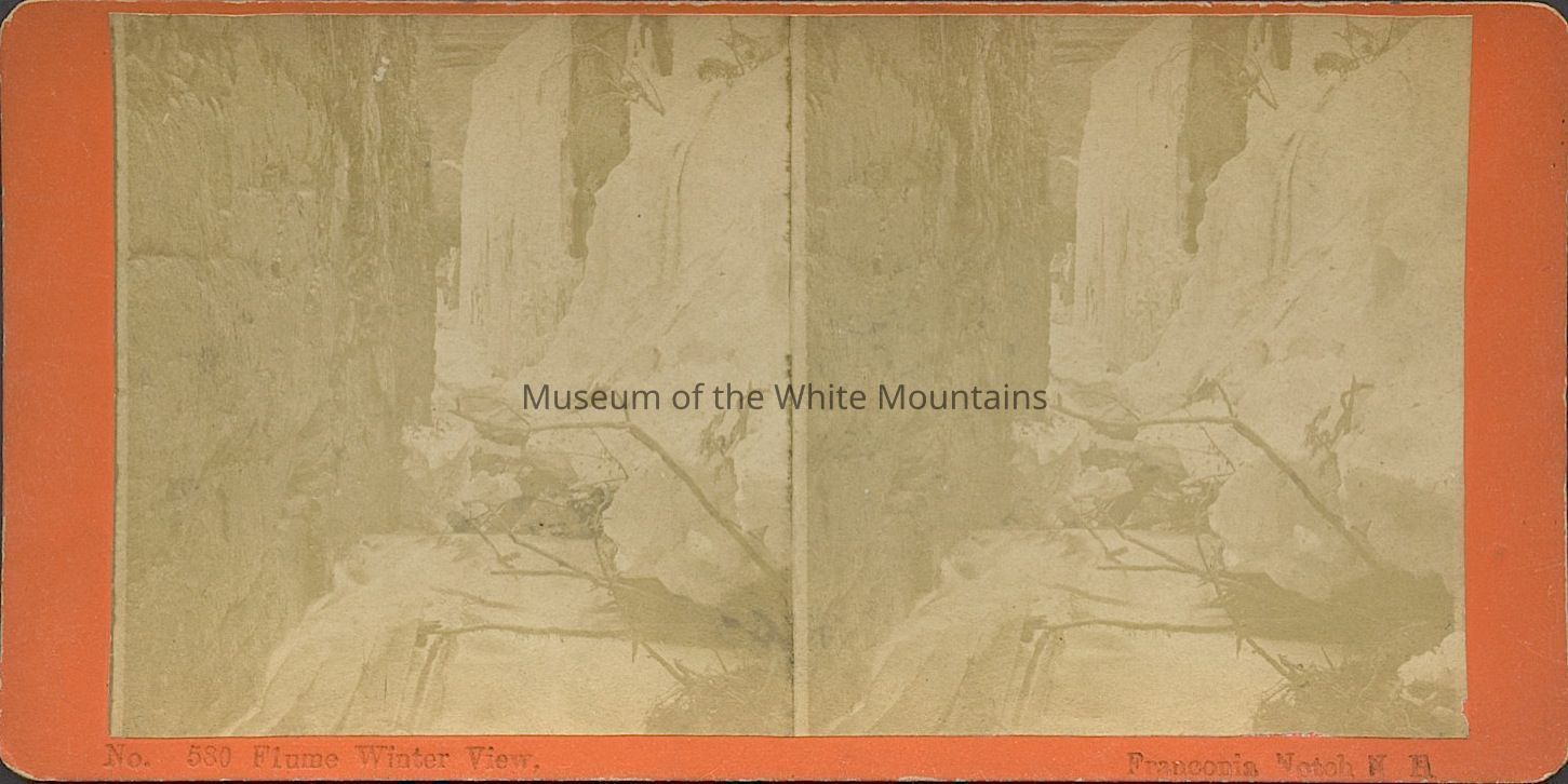 Black and white image of a rocky mountain gorge in winter with lots of ice on one side of the rocks. Caption reads, 'Flume Winter View." Back Description: Plain