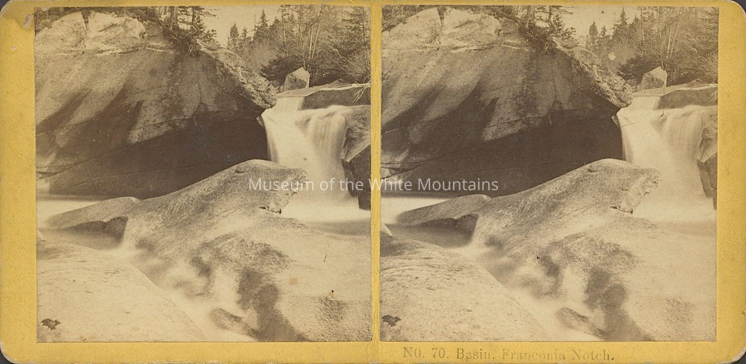 Black and white image of a cascade over large rocks into a pool below. Caption reads, "Basin, Franconia Notch." Back Description: Plain