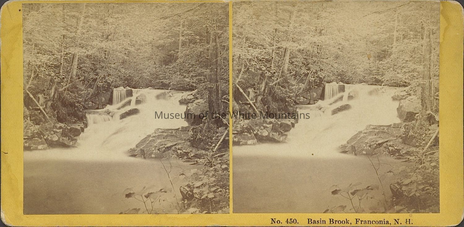 Black and white image of running water among rocks and trees. Caption reads, "Basin Brook Franconia NH." Back Description: Plain