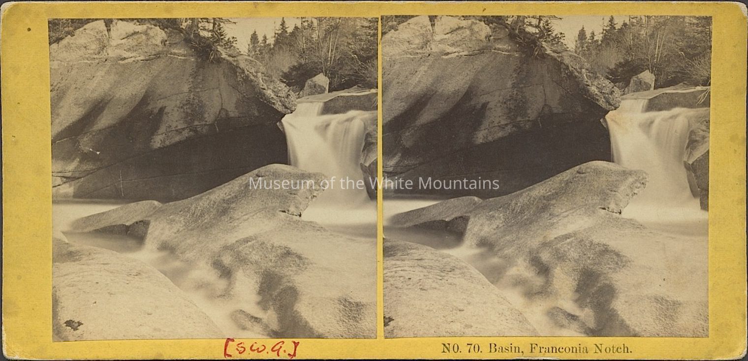 Black and white image of water running over large rocks. Caption reads, "Basin Franconia Notch." Back Description: Plain with writing.