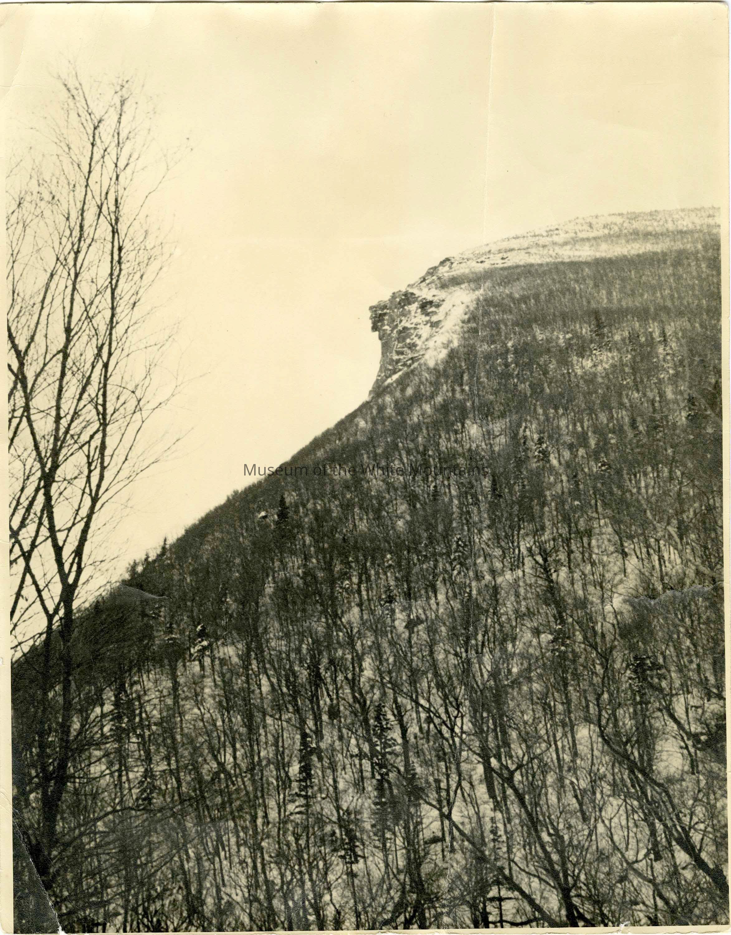 This photo depicts the "Old Man of the Mountain" rock formation from below. It appears to have been taken in winter, as the trees are bare and snow can be seen upon the mountain top. On the back in the upper left hand corner is a label that reads, "Ouellet Photo". beside the label it reads "1947 OLD MAN OF THE MTNS" written in pen.Collection