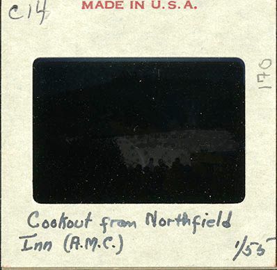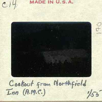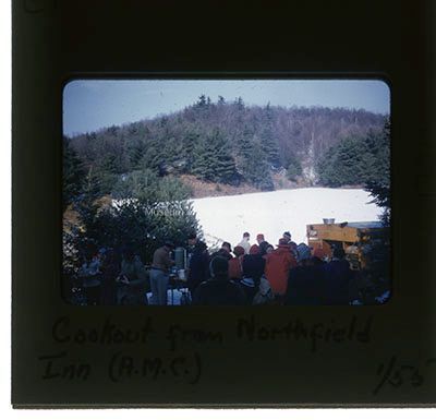 A group of people, bundled up in winter clothing, gather to get hot drinks and food at a cookout out in the snow. Trees cover a mountain in the background. Possibly held or sponsored by the Appalachain Mountain Club. Written on the back is "Cookout from Northfield (A.M.C.), 1/55" as well as the numbers "170" and "C14".