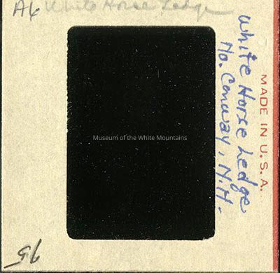 A photograph of White Horse Ledge also depicts green foliage growing on trees and a bright blue sky behind them. There is what appears to be a rock in the foreground. The second image shows the back of the slide and written on it is "White Horse Ledge, No. Conway, N.H." as well as "75" and "A6".Collection