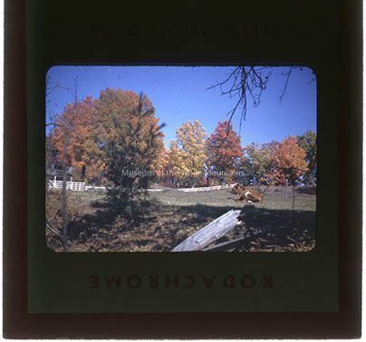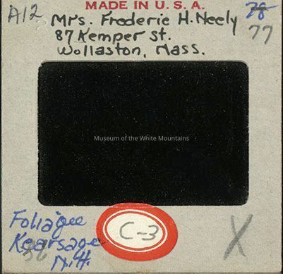 A brown cow basks in the sun in a field, fenced off with a white fence. The field is surrounded by trees with red, orange and gold leaves. An evergreen of some sort is in the foreground and the picture is framed by tree branches. What appears to be a broken fence also sits in the foreground. On the back is written "Foliage, Kearsarge, NH" and the address of Mrs. Federic H. Neely at 87 Kemper St. Wollaston, MA. "A12", "C-3", "77" and a crossed-out "78" are also on the back.