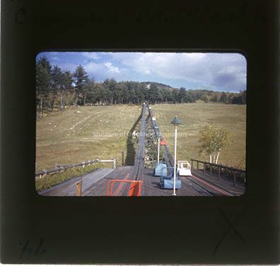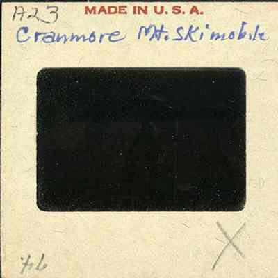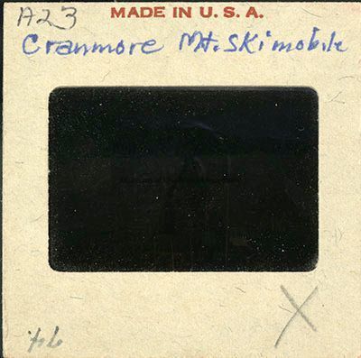A track of some sort stretches across a field into a thick forest. A hill peaks out behind the trees. On the track, are what appears to be different colored ski lifts. On the back, is written "Cranmore, Mt. Ski mobile" as well as "A23" and "74".