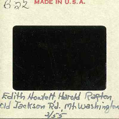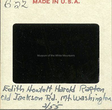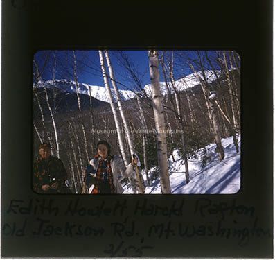 A man and a woman smile for the picture, dressed in warm flannels and surrounded by a snow-covered landscape. The woman is towards the center of the image, holding onto a birch tree and the man is to the left, wearing a red and black checkered hat and coat. Behind them are birch trees and a snow-covered Mount Washington. On the back is written "B22" and "Edith Howlet, Harold Rafton, Old Jackson Rd, Mt. Washington, 2/55".