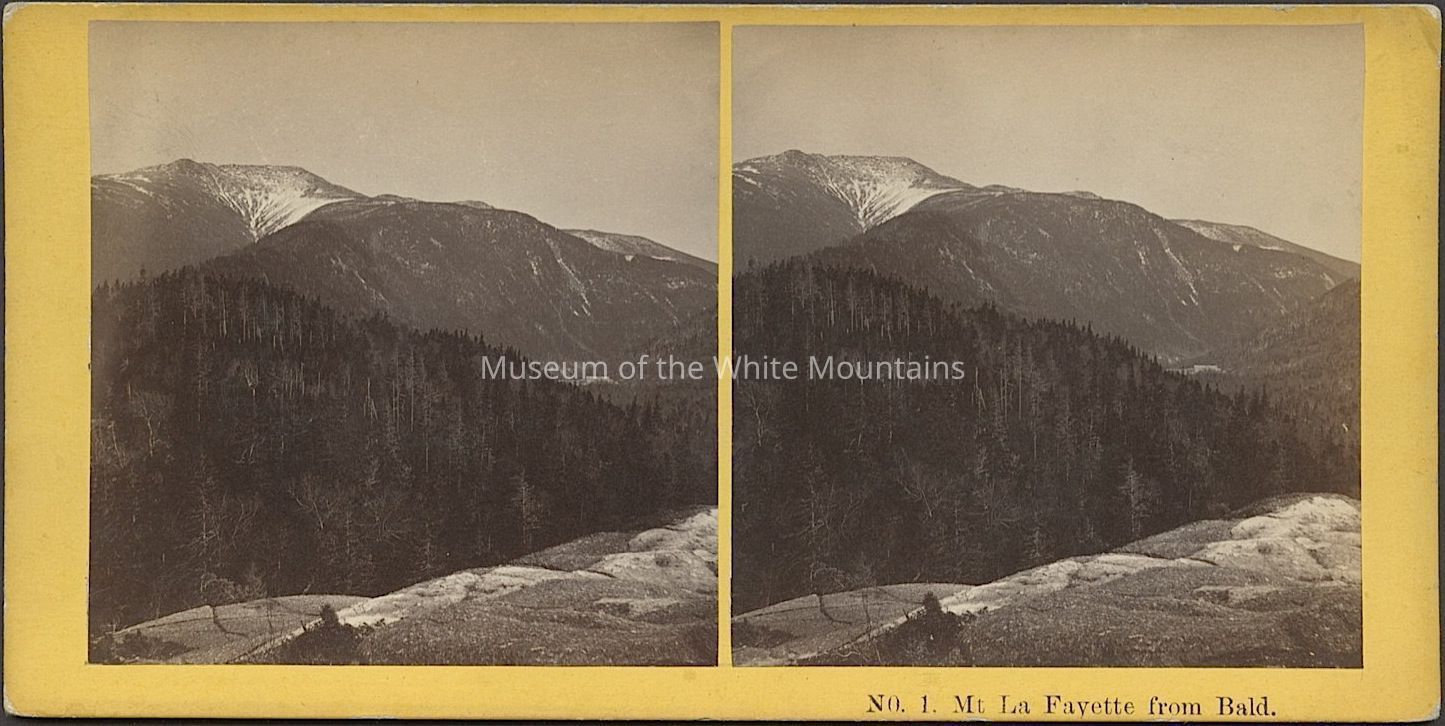 Black and white image of mountains with some snow from the vantage point of another mountain. Caption reads, "Mt La Fayette from Bald. " Back Description: Plain
