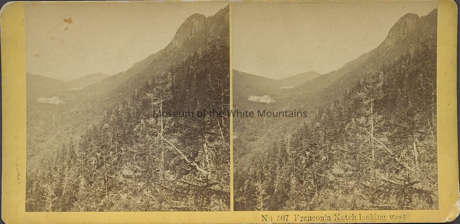 Black and white image of mountains with a hotel in the distance. Caption reads, "Franconia Notch looking west." Back Description: Plain
