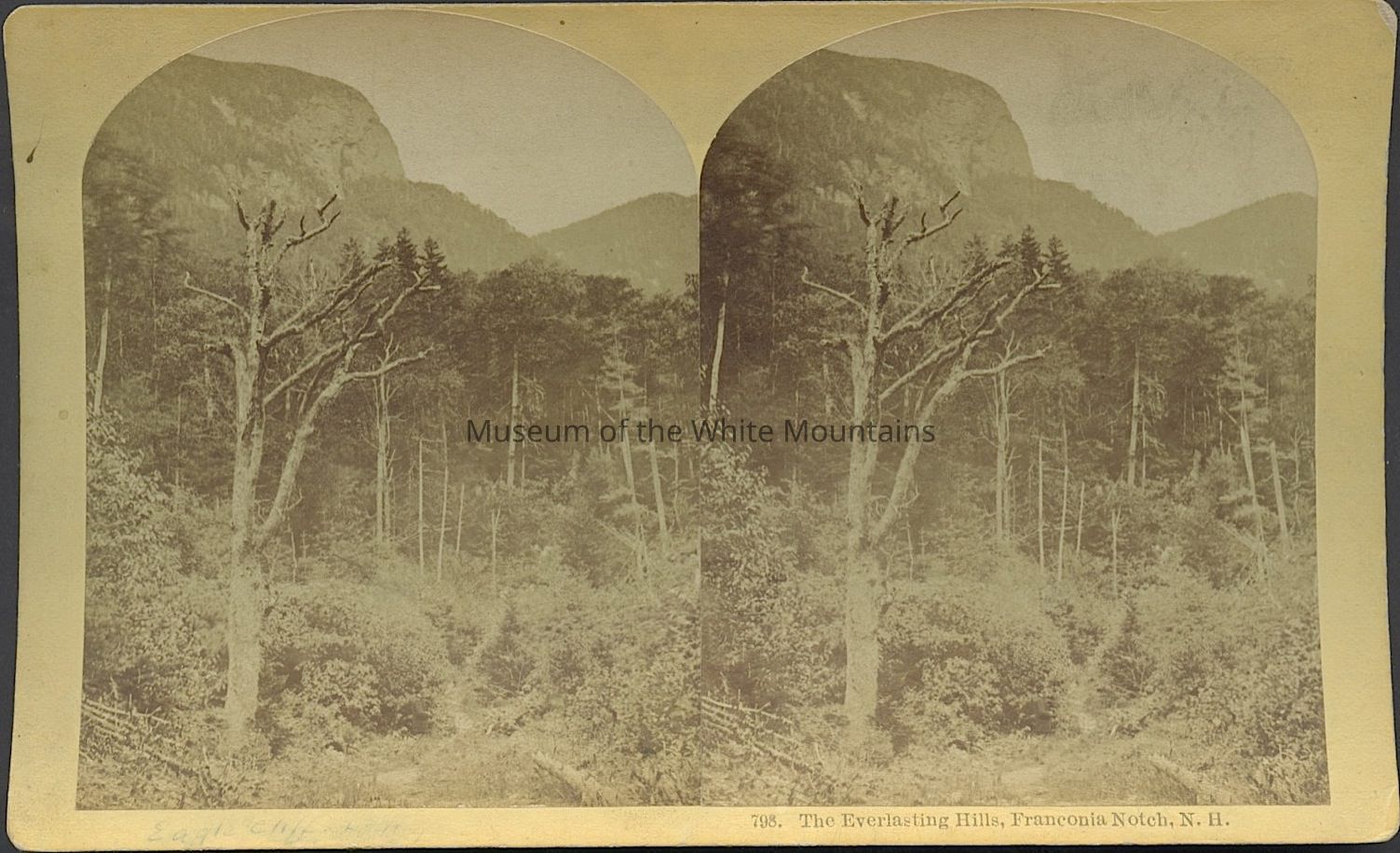 Black and white image of trees with mountains in the background. Caption reads, "The Everlasting Hills, Franconia Notch NH." Back Description: Plain with writing.
