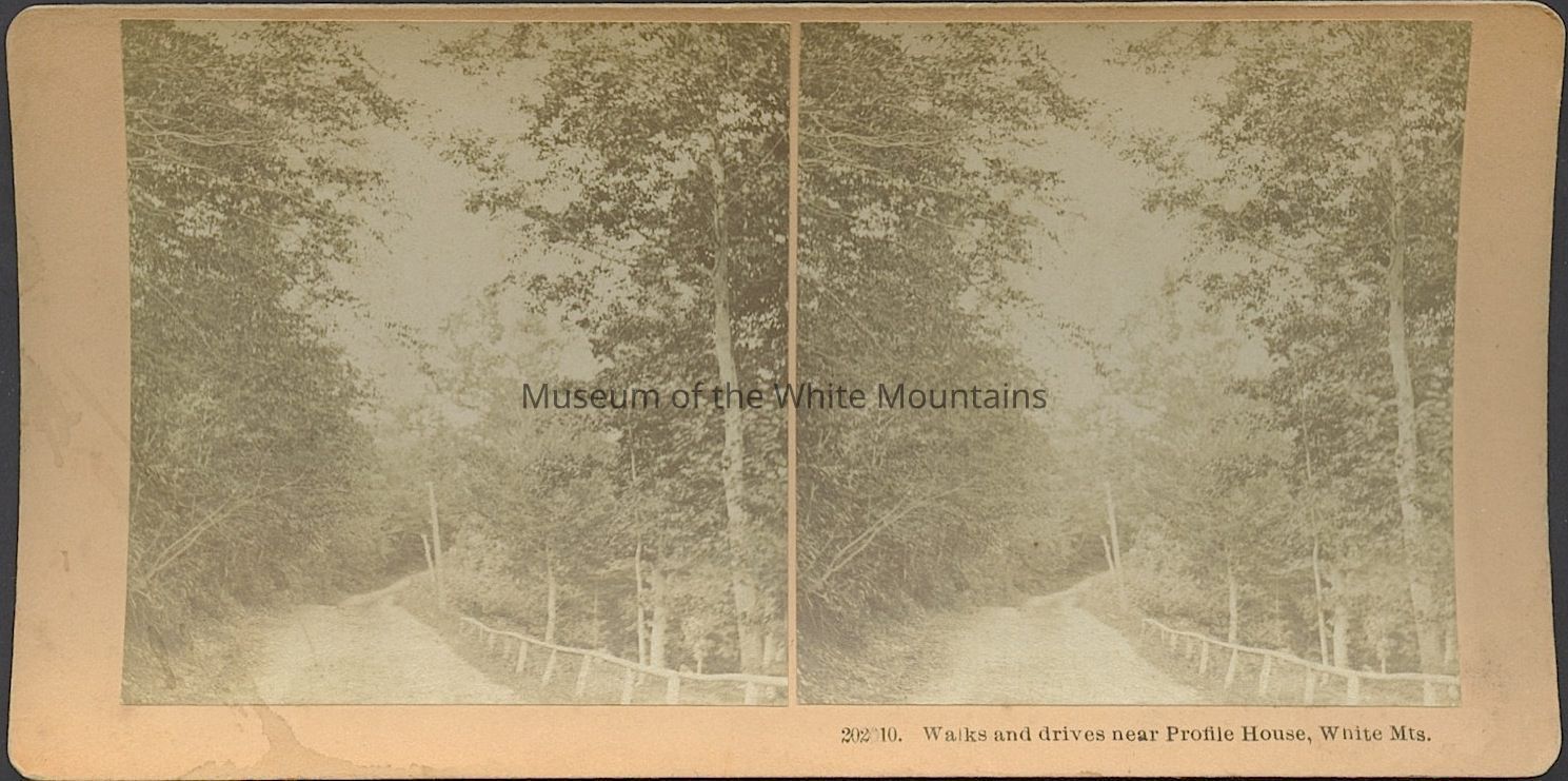 Black and white image of a dirt path among trees with a fence on one side. Caption reads, "Walks and drives near Profile House White Mts." Back Description: Plain