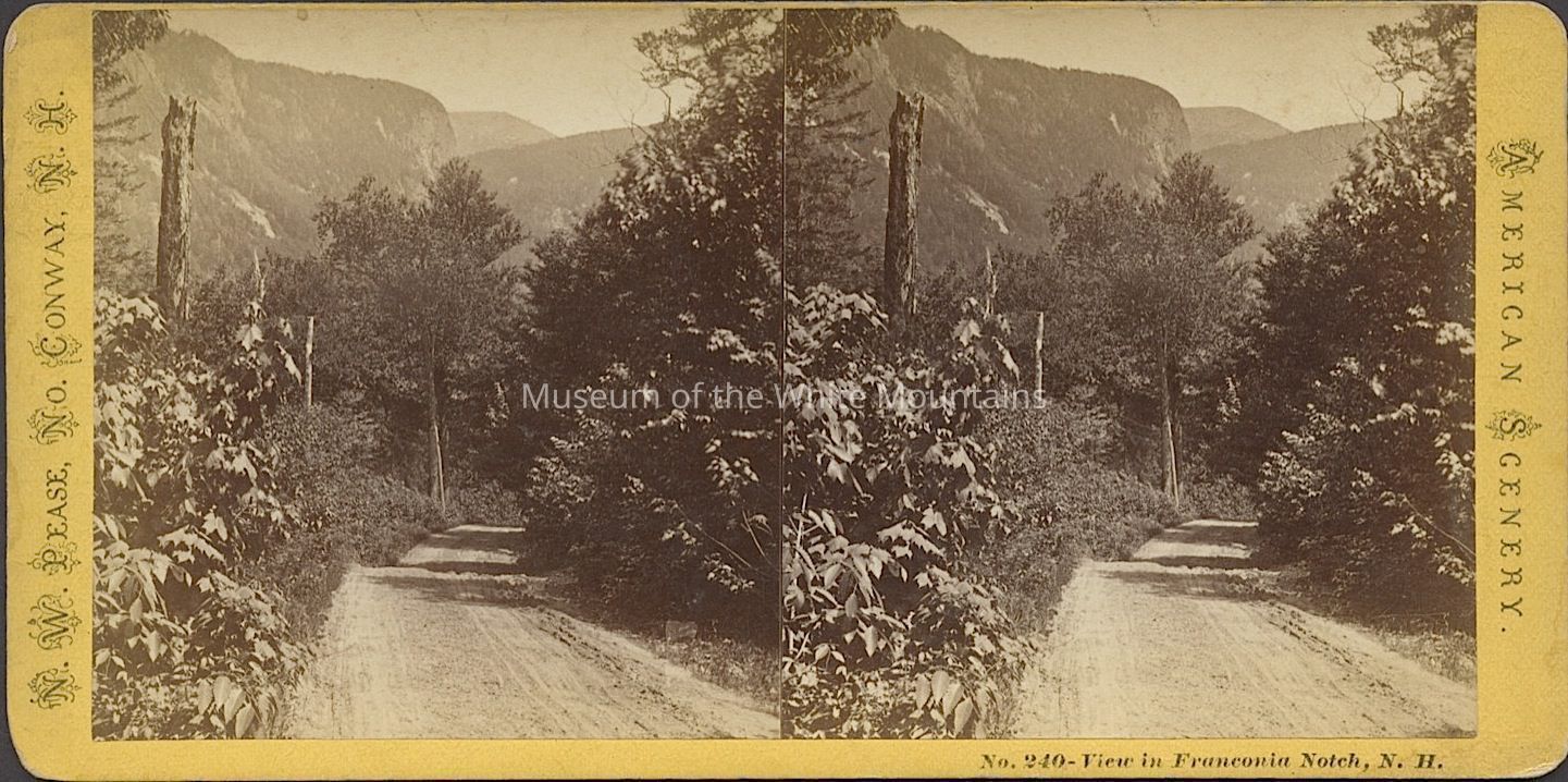 View in Franconia Notch NH. Black and white image of a dirt road among trees with mountains in the background. Caption reads, "View in Franconia Notch NH." Back Description: Plain