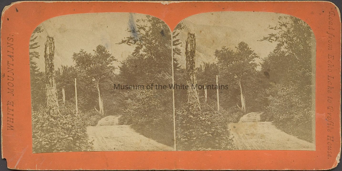 Black and white image of a dirt road among trees with mountains in the background. Caption reads, "Road from Echo Lake to Profile House." Back Description: Plain