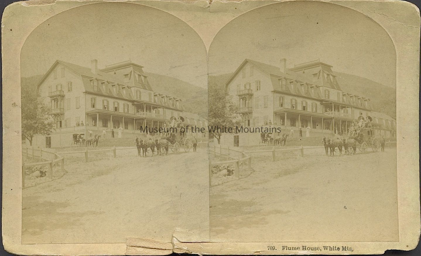 Black and white image of a large hotel with a mansard roof, several dormers, a large porch and center tower. Many people, a carriage, a coach, horses, a fence and a dirt road are out front. Caption reads, "Flume House White Mts."