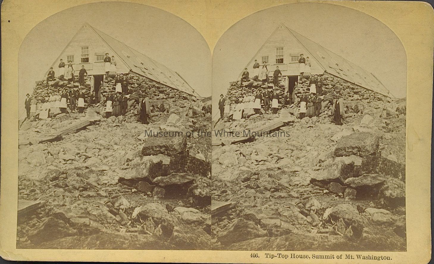 Black and white image of several people outside a small building in a rocky mountain setting. The ground floor of the building is covered in stones on its exterior. Caption reads, "Tip-Top House, Summit of Mt. Washington." Back Description: Plain