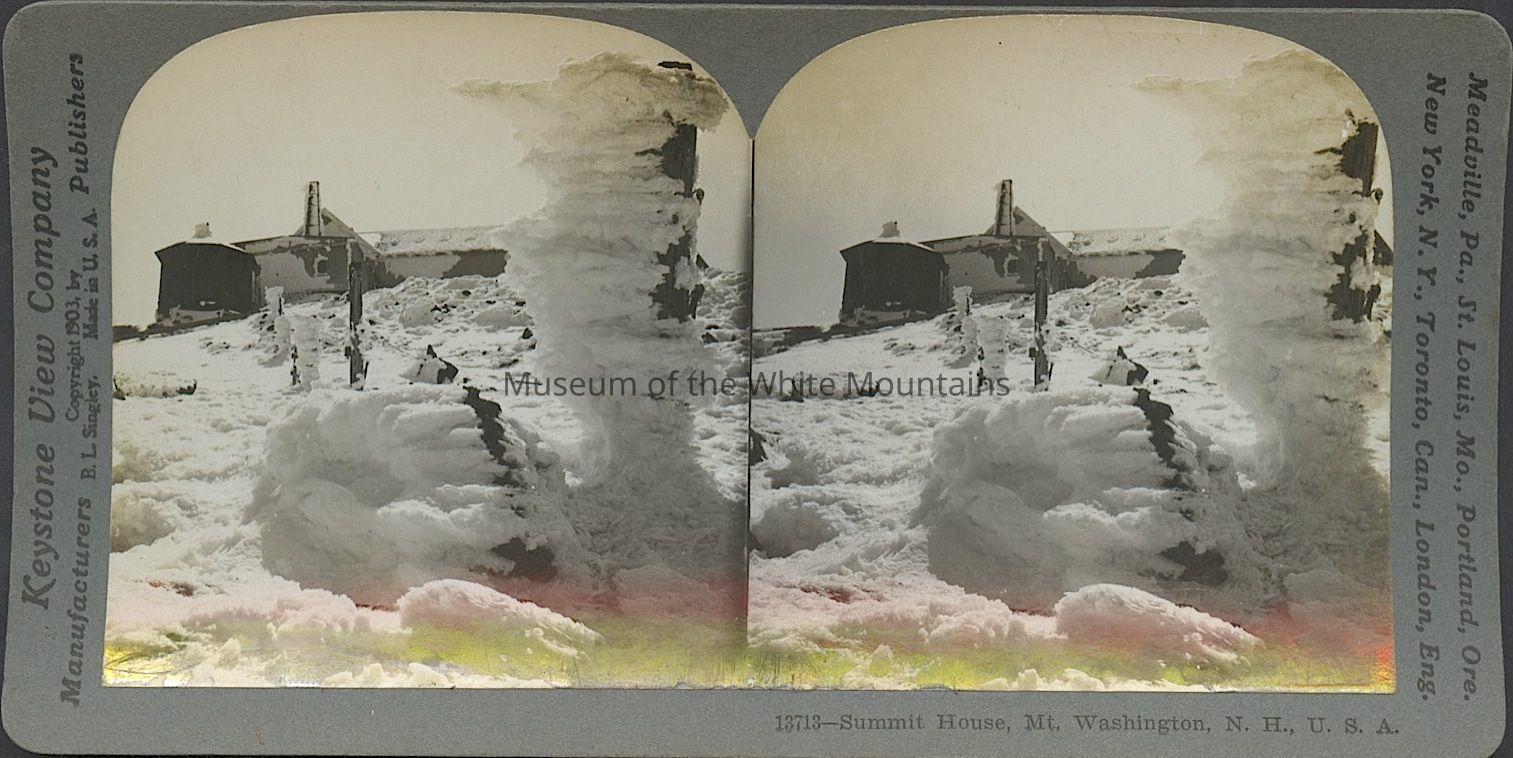 Black and white image of a snow and ice covered building on a mountain top. Caption reads, "Summit House, Mt. Washington." Published by Keystone View Company. Back Description: Includes a paragraph on subject