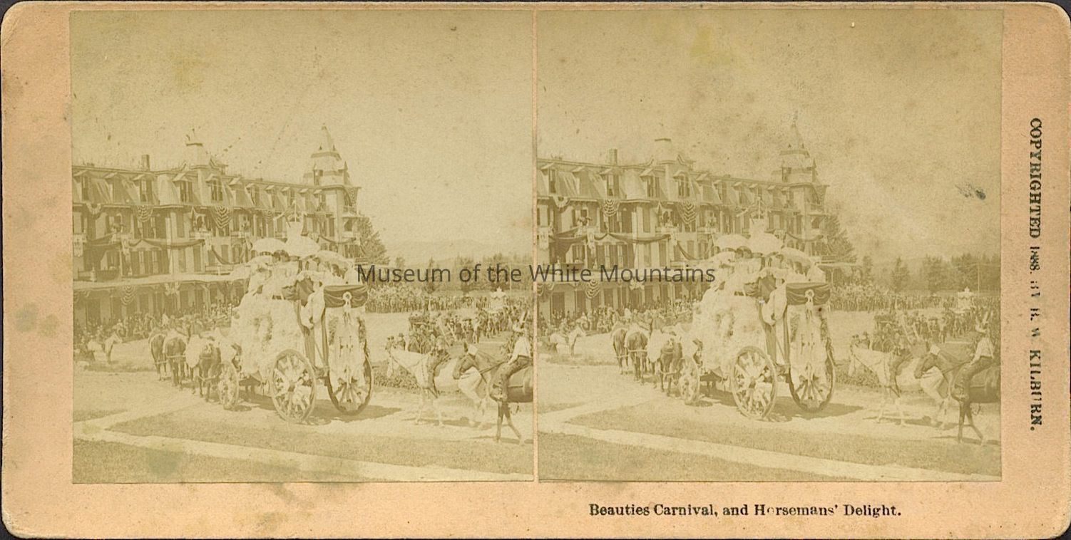 Black and white image of a decorated large hotel with turrets and many dormers and a large porch. Out front are decorated carriages and horses. On the carriages are dressed-up ladies with parasols. Caption reads, "Beauties Carnival and Horsemens' Delight". Back Description: Plain with writing