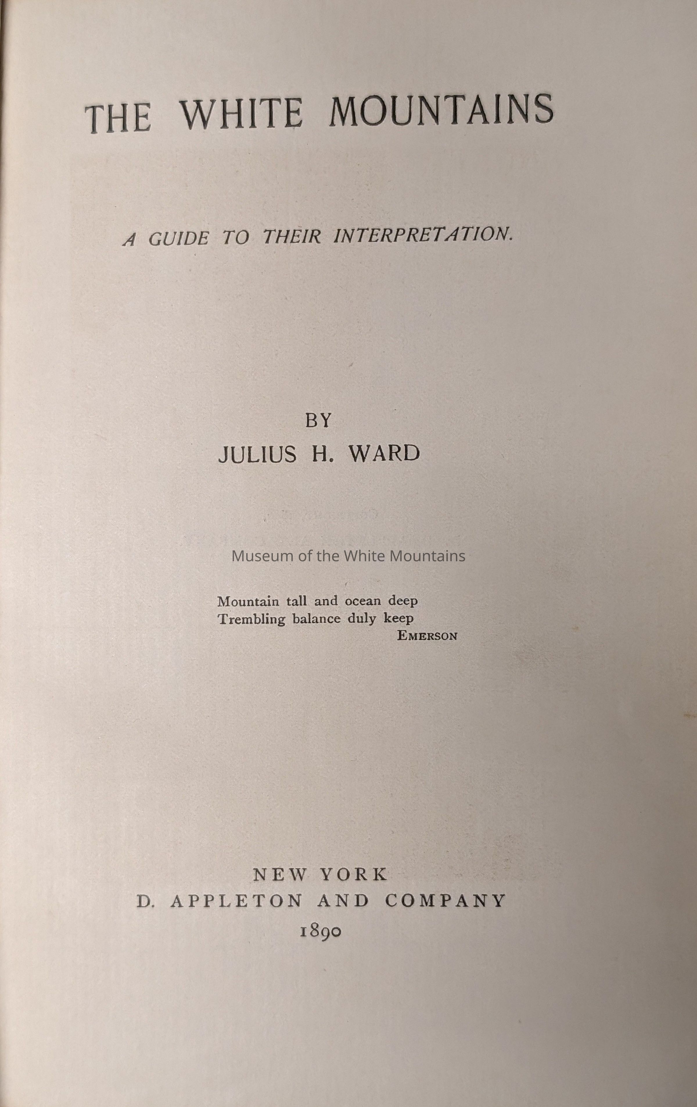 This is a book from the late 1800's that focuses on the natural aspect of the White Mountains and includes both a guide and intinerary style format. Including explanation of physical and geographic processes and locations as well as exloring the interest and lure of the mountains refering to Ralph Waldo Emerson. Physical Description: Dark green colored, hard cover. Title and authors's name on front cover in gold lettering, includes a silohouette of the Old Man of the Mountain with a full moon and clouds in the background. Along the spine it has the title, author's last name and small impression.