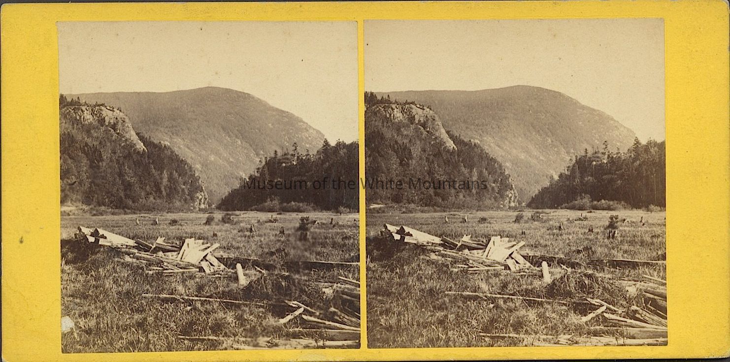Black and white image of a clearing with tree stumps and lumber. In the background is a mountain notch and ledge. Back Description: Plain