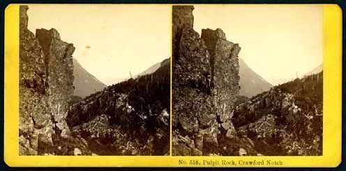 This is a sepia toned stereoview photo of Pulpit Rock in Crawford Notch. There are two photos side by side with a yellow background. Printed on front: "No. 518. Pulpit Rock, Crawford Notch"