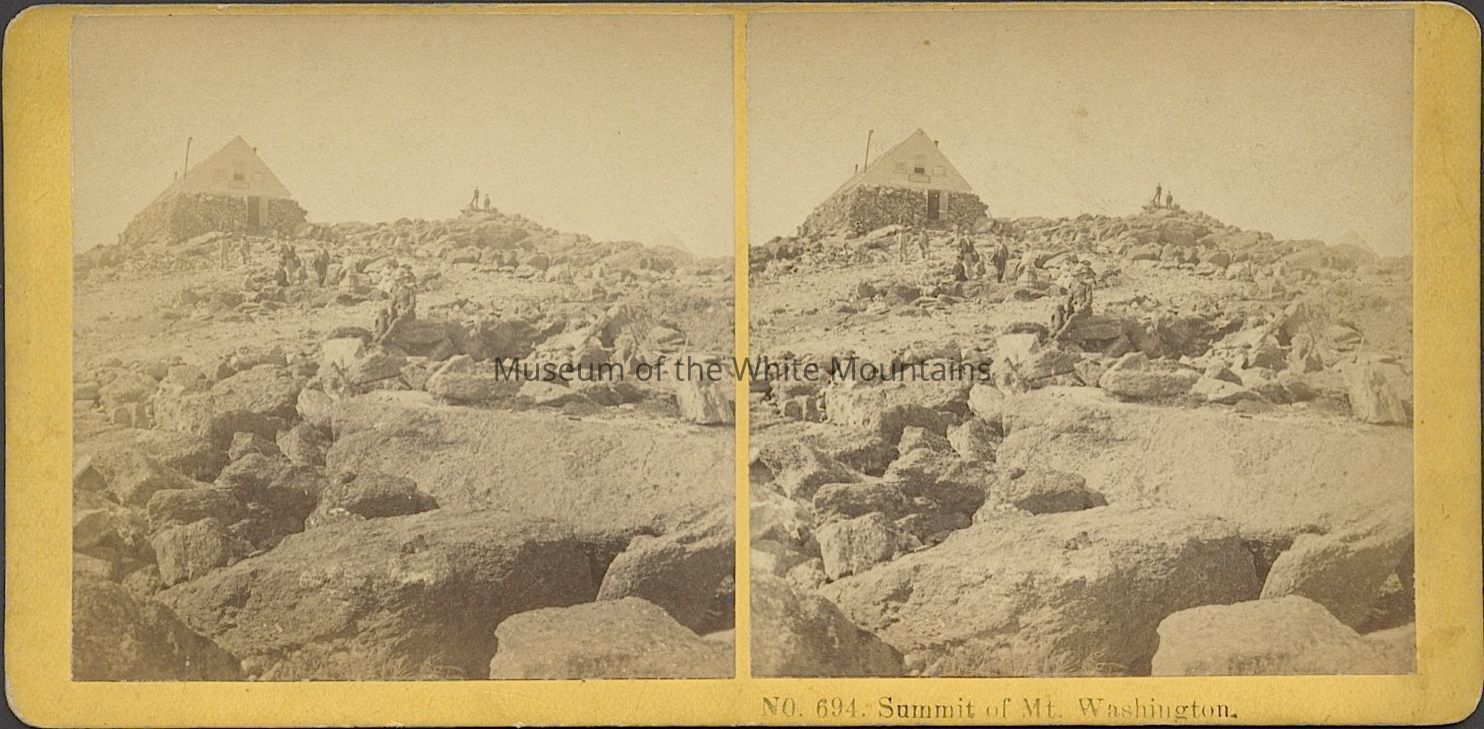 Black and white image of several people outside a small building in a rocky mountain setting. The ground floor of the building is covered in stones on its exterior. Caption reads, "Summit of Mt. Washington." Back Description: Plain