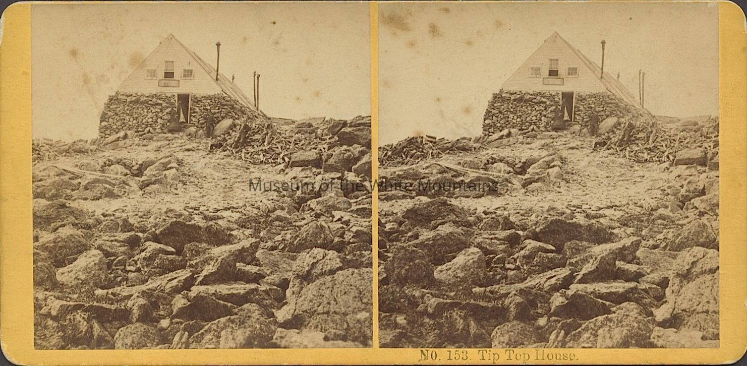 Black and white image of several people outside a small building in a rocky mountain setting. The ground floor of the building is covered in stones on its exterior. Also in view are wood piles. Caption reads, "Tip-Top House, Summit of Mt. Washington." Back Description: Plain