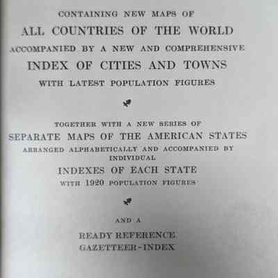 This is an extensive map book containing maps of all the countries in the world and each state in the U.S. It also includes updated population figures circa 1920 as well as a index of cities and towns for each state.
