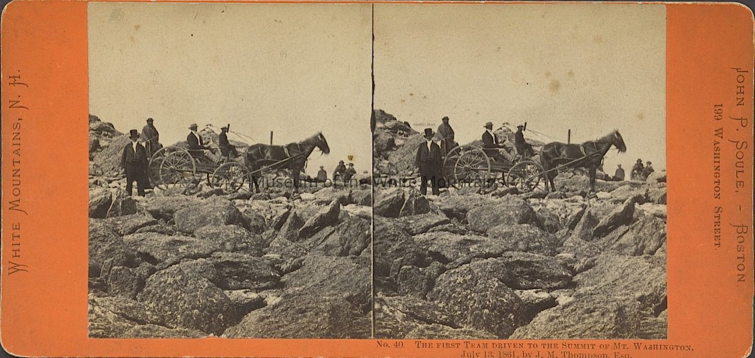 Black and white image of a horse-drawn cart with several people standing in a rocky setting. Caption reads, "The first team driven to the summit of Mt Washington July 13 1861 by J. M. Thompson Esq." Back Description: Plain