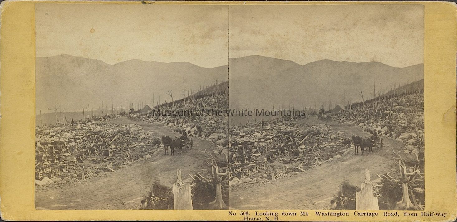 Washington, Mount (Coos county, New Hampshire : mountain), Mount Washington Carriage Road (Coos county, New Hampshire : road), Halfway House (Coos county, New Hampshire : inhabited place), roads, mountains, rocks, horses, carts, tree stumps, Buildings,