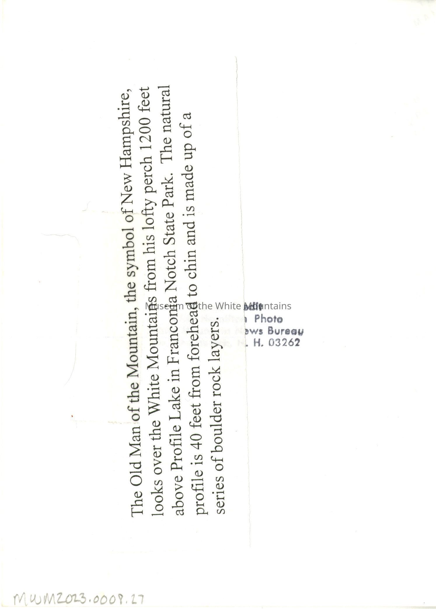 The Old Man of the Mountain, the symbol of New Hampshire, looks over the White Mountains from his lofty perch 1200 feet above Profile lake in Franconia Notch State park. The natural profile is 40 feet from forehead to chin and is made up of a series of boulder rock layers.Type