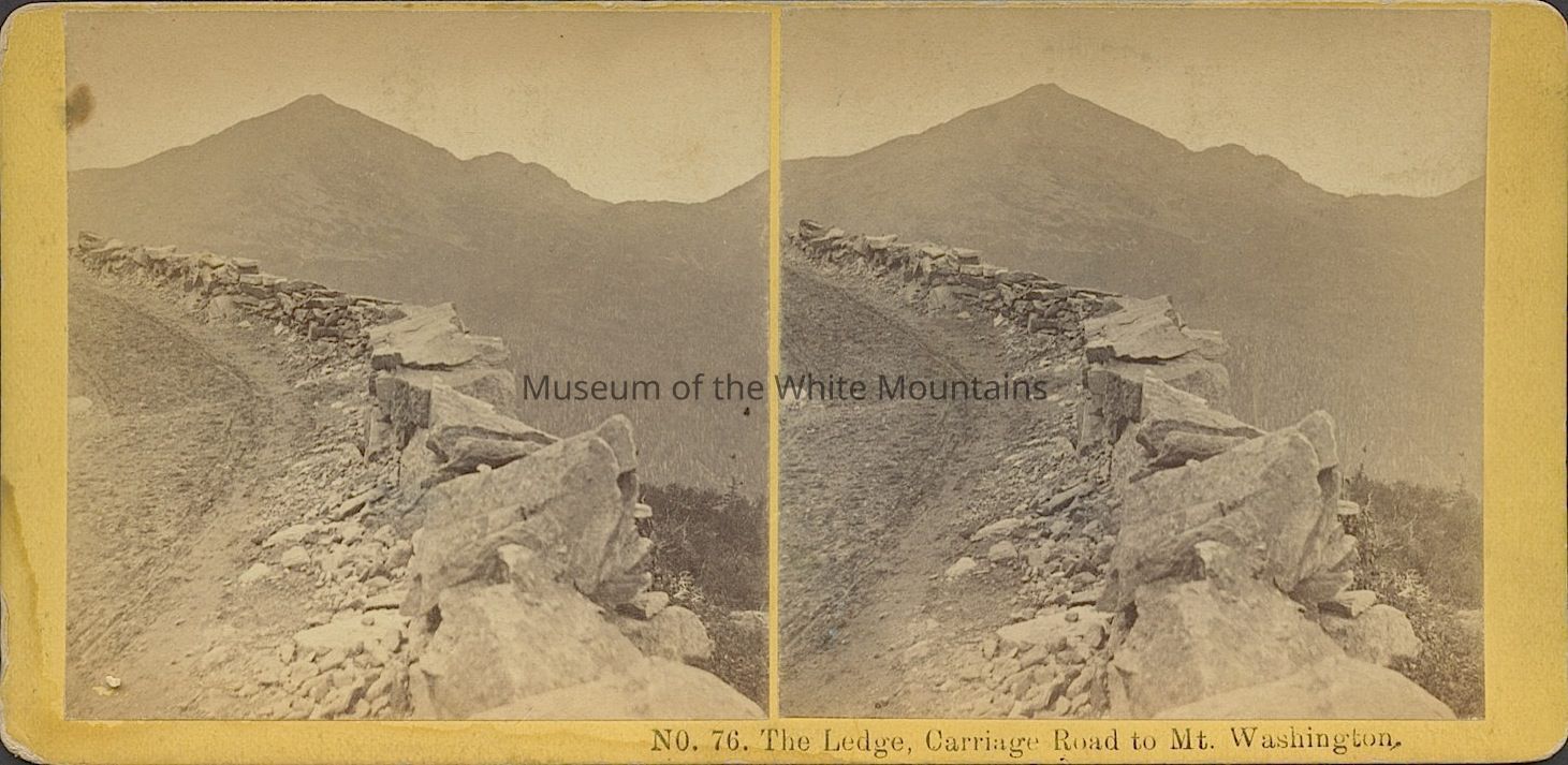Black and white image of a dirt road by a rocky ledge with mountains in the background. Caption reads, "The Ledge, Carriage Road to Mt Washington." Back Description: Plain