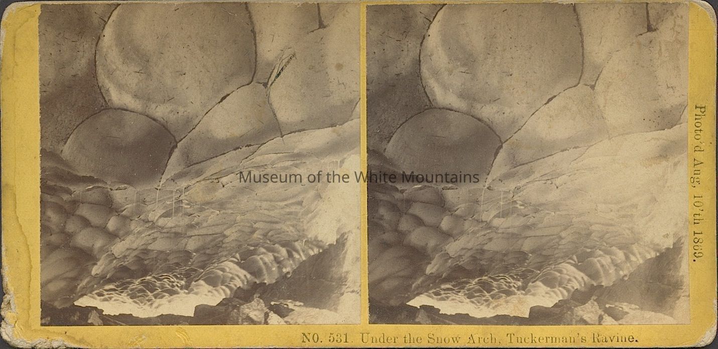 Black and white image of a snow formation. Caption reads, "Under the Snow Arch Tuckerman's Ravine." Back Description: Plain