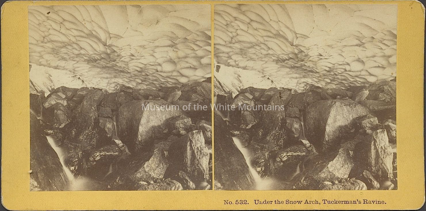 Black and white image of a snow formation among rocks on a mountain. Caption reads, "Under the Snow Arch, Tuckerman's Ravine." Back Description: Plain with writing
