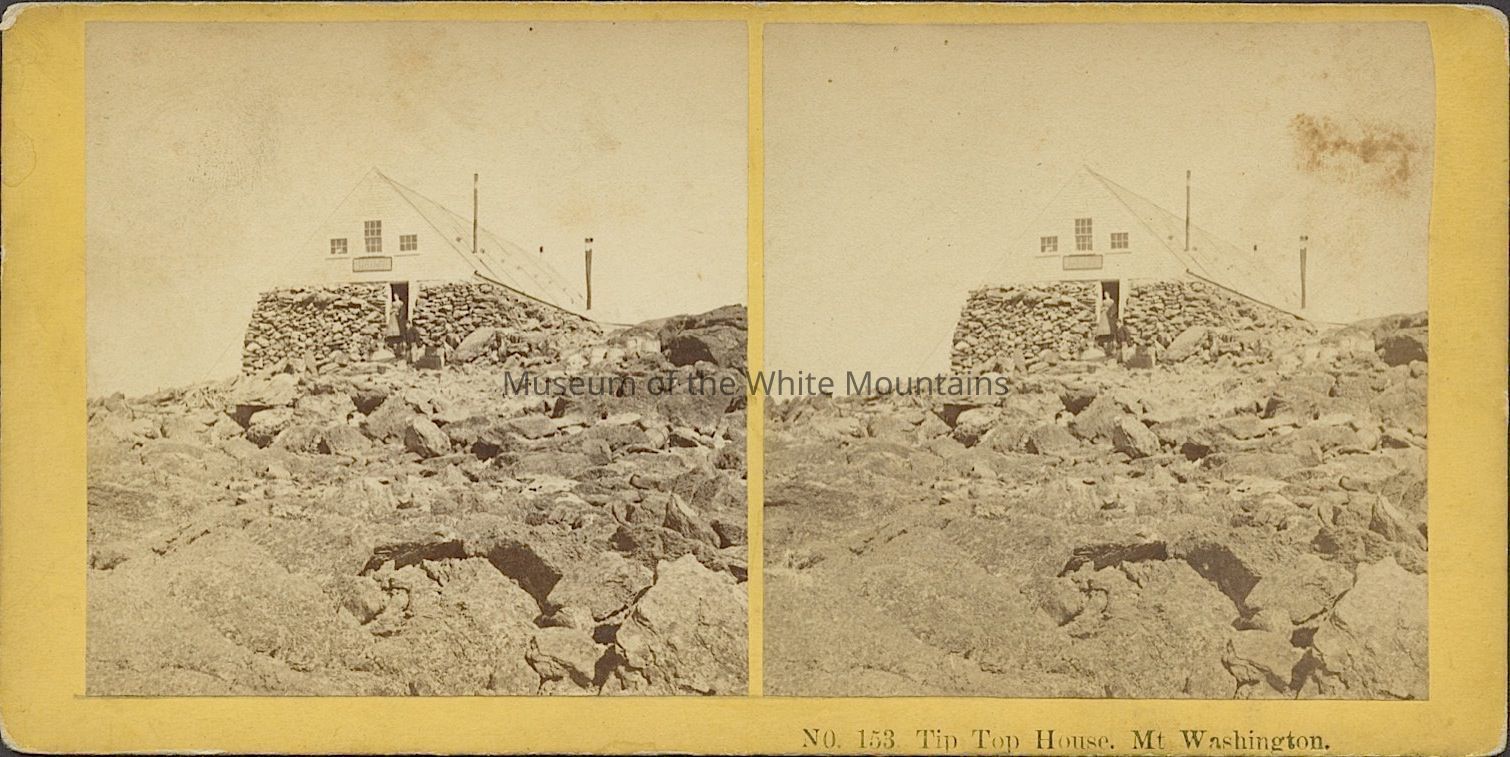Black and white image of a small building in a rocky mountain setting. The ground floor of the building is covered in stones on its exterior. Caption reads, "Tip-Top House, Mt. Washington NH." Back Description: Plain