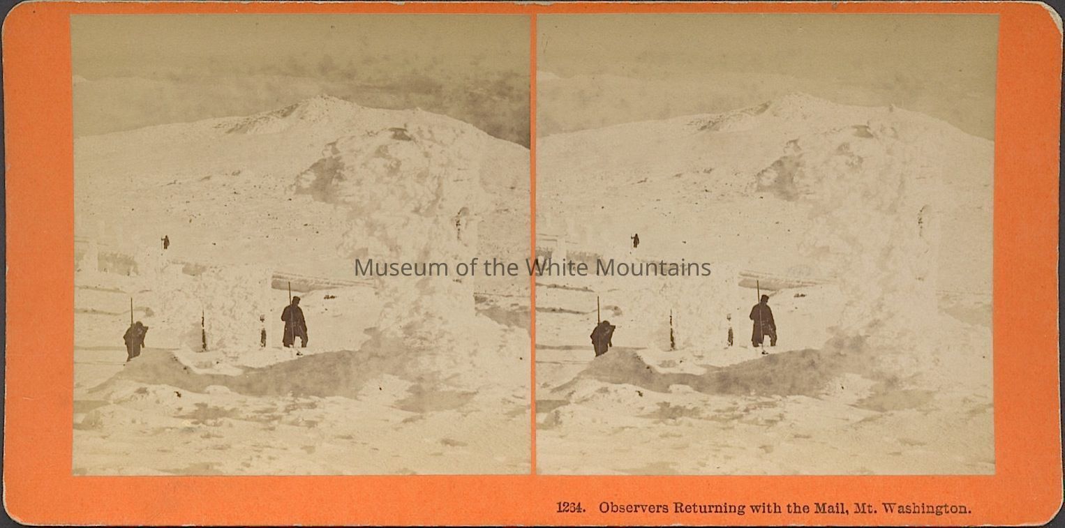 Black and white image of people standing in a snowy and icy landscape by what appears to be covered buildings. Caption reads, "Observers Returning with the Man, Mt Washington." Back Description: Plain