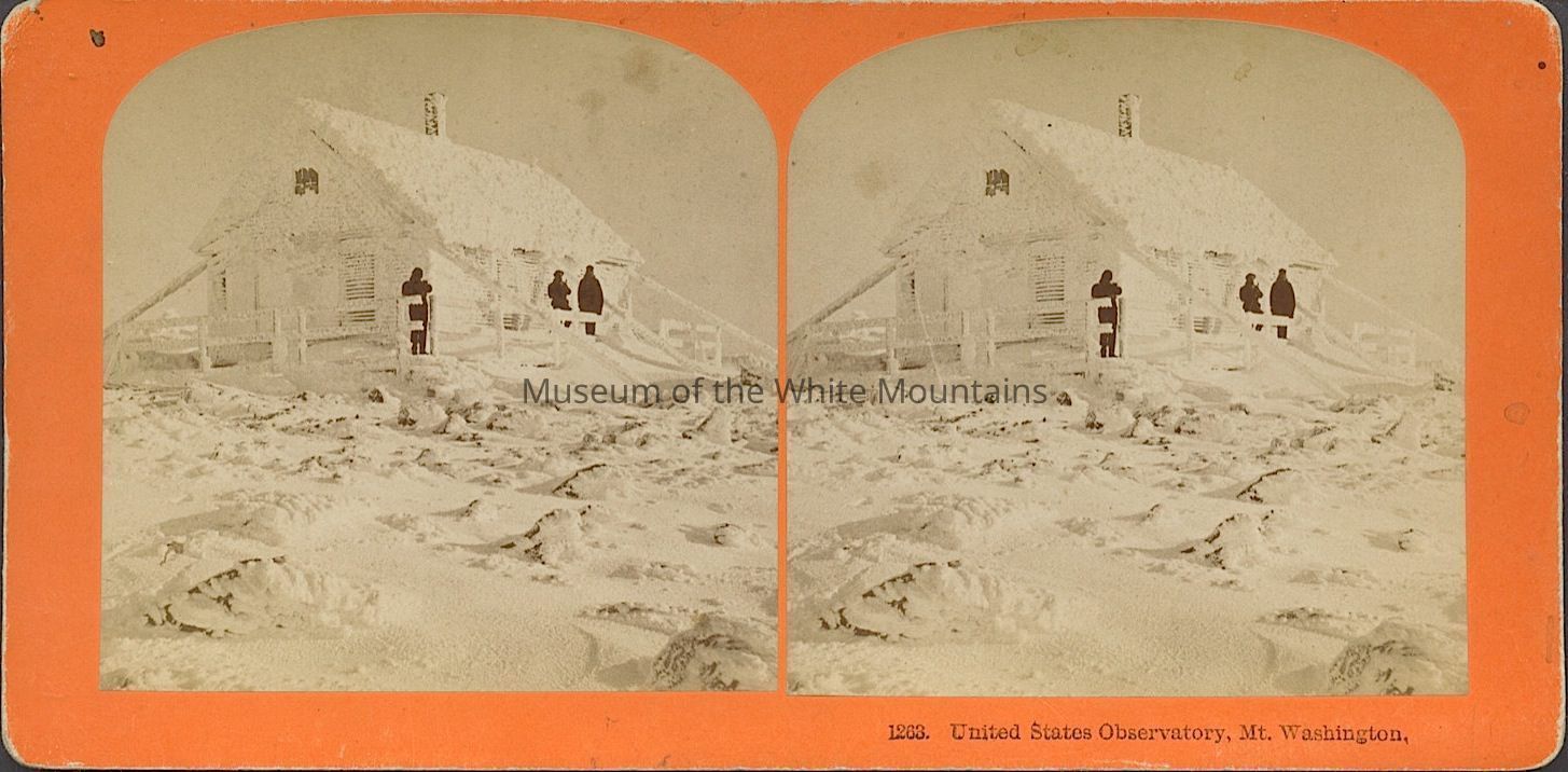 Black and white image of a snow and ice covered building on a mountain top. People stand on its porch. Caption reads, "United States Observatory Mt Washington." Back Description: Plain