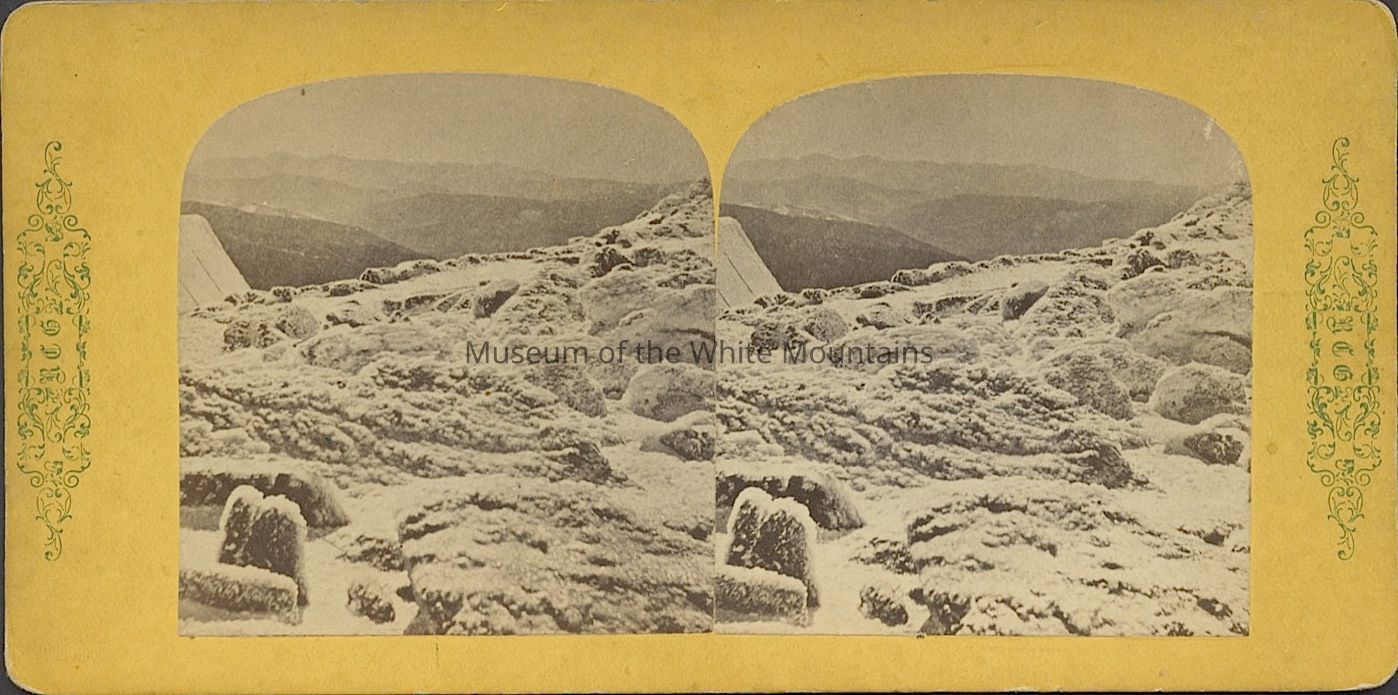 Black and white image of a rocky mountain scene with some snow and ice. In the distance are more mountains. Back Description: list of items with "Frost Work" highlighted