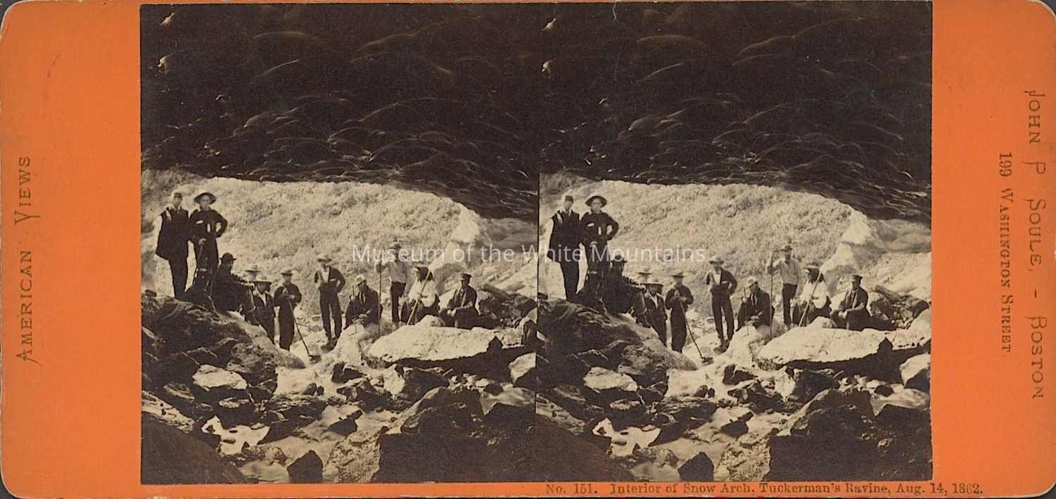 Black and white image of several people standing by the opening of a cave. Caption reads, "Interior of Snow Arch Tuckermans Ravine Aug 14, 1862." Back Description: Plain