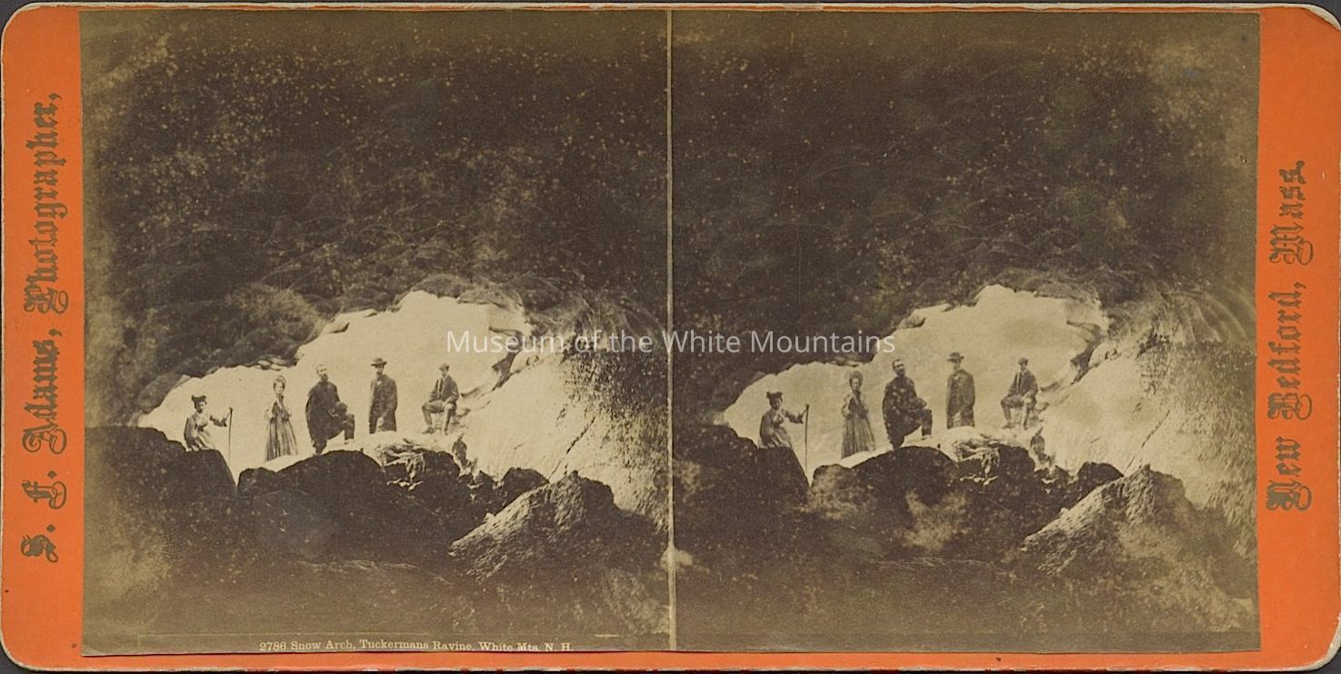 Black and white image of several people standing by the opening of a cave. Caption reads, "Snow Arch Tuckermans Ravine." Back Description: Plain