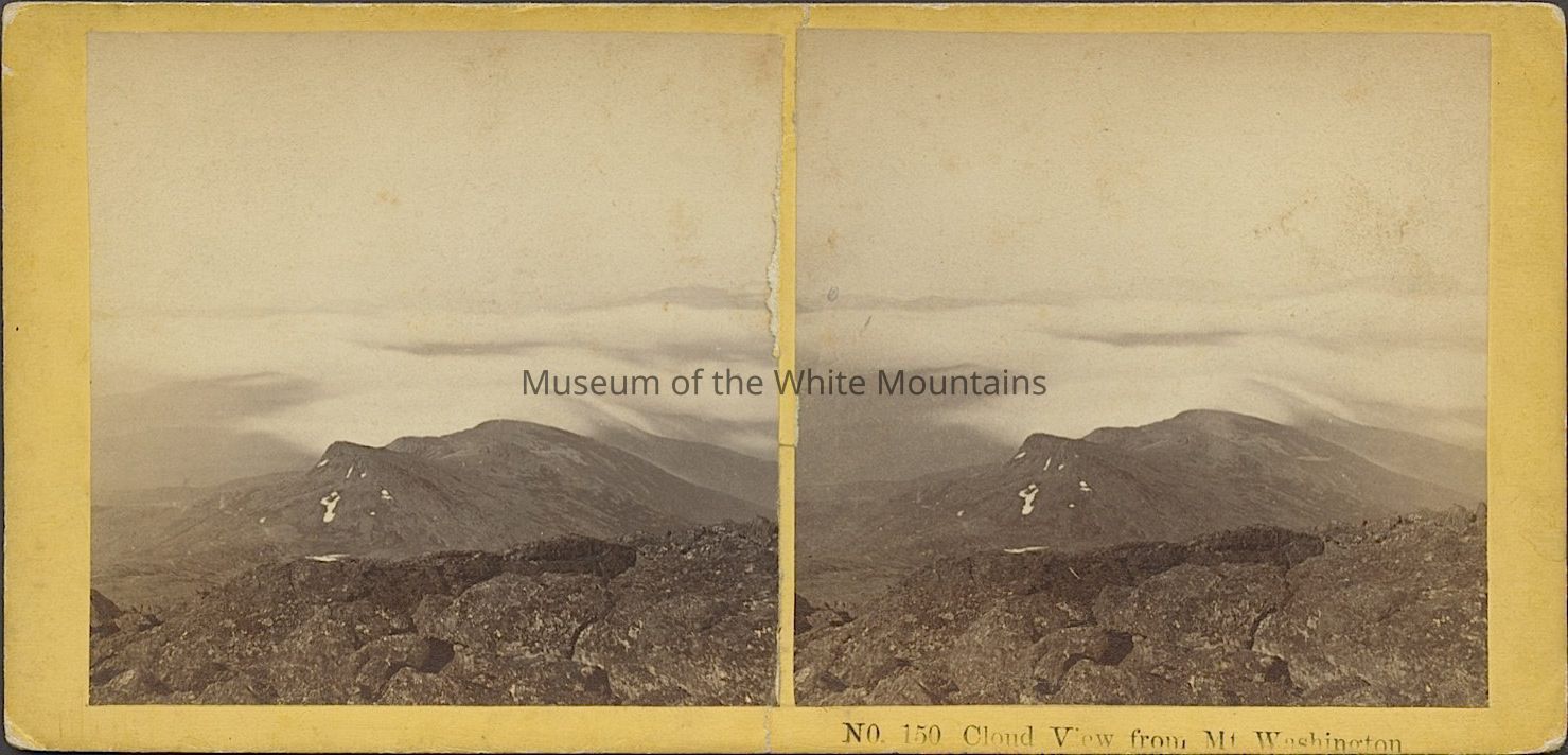 Black and white image of clouds among mountains. Caption reads, "Cloud View from Mt Washington." Back Description: Plain