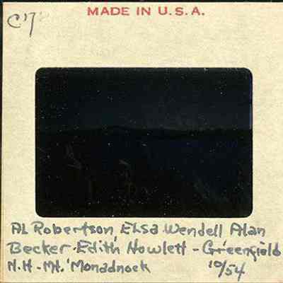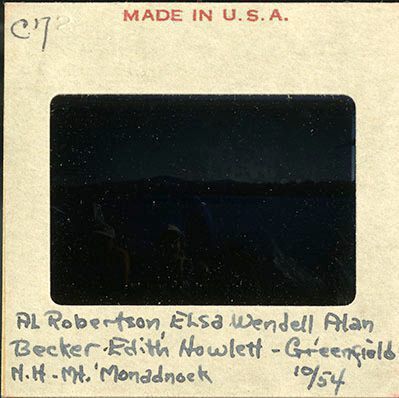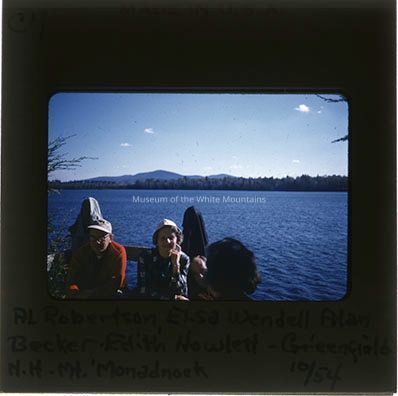 Two men and two women sit on what seems to be a porch, overlooking a lake. A man and woman, both wearing hats, face the camera, as another man peers over the shoulder of a woman, who is facing away. It is a sunny day and Mount Monadnock sits in the background with a forest lining the water. Written in marker on the back is "AL Roberston, Elsa Wendell, Alan Becker, Edith Howlett--Greenfield, N.H, -- Mt. Monadnock, 10/54". "C7" is also penned on the back.Collection