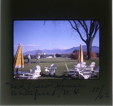 Two men in the midground play a round of golf, with a view of the mountains in the background. Two tables with yellow umbrellas sit on either side of the foreground, with white chairs surrounding them. A tall tree and several smaller ones, sit on the right in the midground and the top of a white building peaks out behind them. On the back, "Mt. View House, Whitefield, N.H, 10/62" is written.
