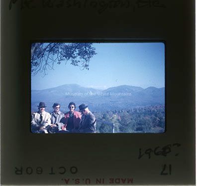 Four people look to be sitting, facing and smiling at the camera. The second from the left and the one on the right, are not looking directly at the camera. Two of them are wearing hats and they are all dressed well. A tree branch hangs over them. Behind them, is a forest that stretches out to Mount Washington and the Presidential Range. Some of the leaves on the trees have begun to turn red, suggesting autum. On the back "Mt. Washington, etc" and "1966?" is written in pen.Collection