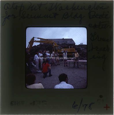 A crew of people gather around a man standing a red table, with a bulldozer in the background. Rubble is piled up behind them and the top of a building can be seen. Most people are on the left side of the image, with two people directly in front of the camera. Some people can be seen in the background as well. On the back, "Atop Mt. Washington for Summit Bldg" and "Ground wrecking, 6/78" are written. There are other words, but they are crossed out and difficult to discern.